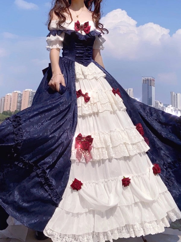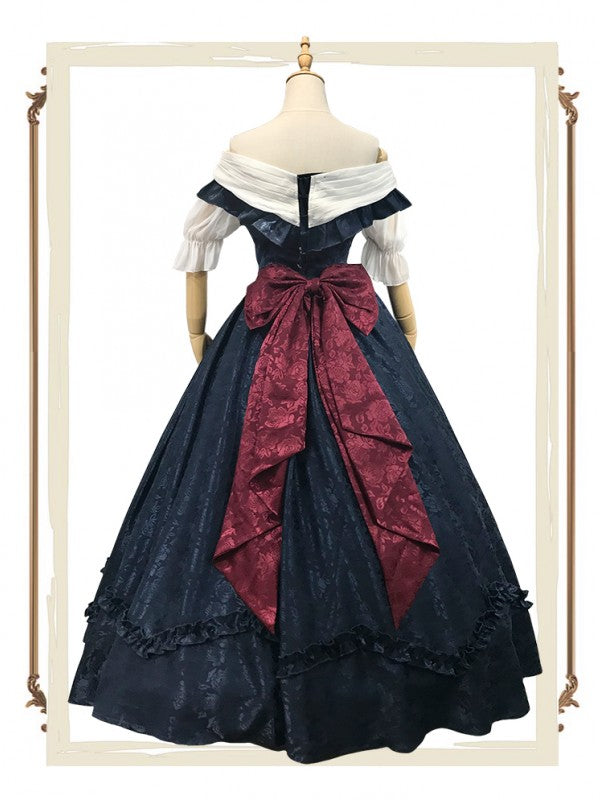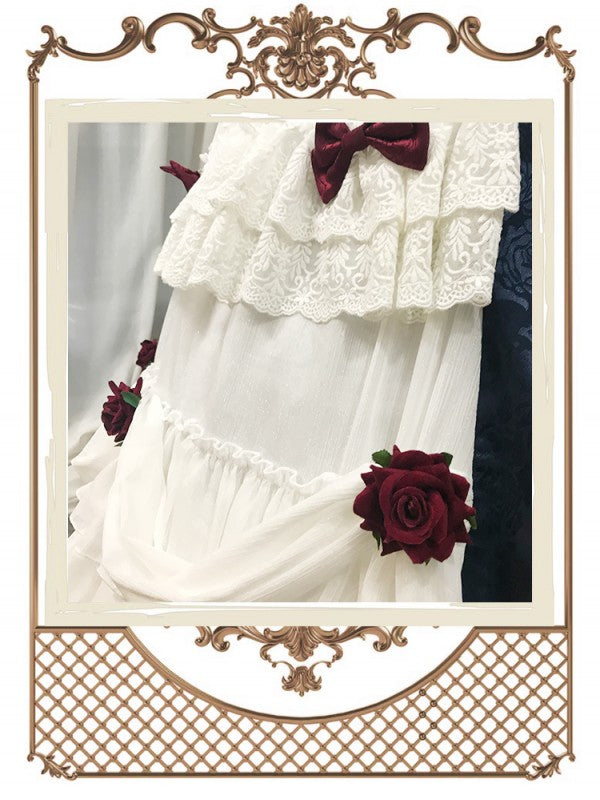 Features: It features back shirring and lace-up back, open front design, ruffled off the shoulder neckline, rose ACC included, a large bow on the back.